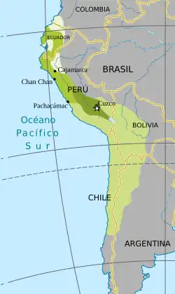 L'Empire Inca, avec son centre administratif, politique et militaire à Cusco[9], était la civilisation précolombienne la plus vaste et puissante d'Amérique. Au début du XVIe siècle, le Tahuantinsuyo a atteint son extension maximale, dominant un territoire qui s'étendait, du nord au sud, de l'Équateur actuel et une partie de la Colombie jusqu'au centre du Chili et au nord-est de l'Argentine, et d'ouest en est, de la Bolivie aux jungles amazoniennes[10].
