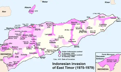 Le , le Front révolutionnaire pour l'indépendance du Timor oriental (Fretilin) (Frente Revolucionária de Timor-Leste Independente) déclara l'indépendance du Timor oriental. Neuf jours plus tard, l'armée indonésienne, armée et soutenue politiquement par les États-Unis[7], envahissait le territoire. L'ONU condamne l'occupation indonésienne par la résolution 384 votée le [8] : invasion indonésienne du Timor oriental.