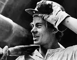 Un bétonnier de la brigade des komsomols (URSS). Photo prise en 1972. La propagande soviétique mettait en avant les héros productifs pour illustrer sa capacité à produire des biens d'équipement.