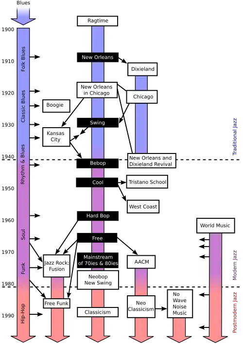 L'une des principales influences de la racine du jazz, outre les chants religieux (Negro spirituals, puis Gospel songs) et les work songs (chants de travail des esclaves dans les plantations de coton), est le blues, une autre musique noire rurale, née à la fin du XVIIIe siècle, et qui évolua avec la migration des populations noires vers les grandes agglomérations, à la fin du XIXe siècle.