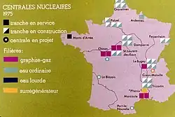 Les pouvoirs publics répliquent en favorisant l’extension des sites existants et la construction de paliers plus puissants pour limiter le nombre de nouvelles centrales. Finalement, sur 43 sites potentiels retenus en 1974[k],[145], dix-neuf accueilleront les REP français, dont quatre sont déjà occupés par des réacteurs UNGG. En plus d'enjeux liés au réseau électrique français, le choix des sites est stratégique : Dix-sept des dix-neuf communes (hors Gravelines et de Nogent-sur-Seine) choisies pour abriter des centrales partagent le même caractère rural et souffraient de dépopulation et de l’absence d’industries[146]. Les revenus, aménagements et emplois liés aux centrales vont créer des formes de dépendances très fortes des territoires autour des sites d’implantation. De plus, pour minimiser l’impact de ses installations sur les paysages, EDF commence avec le palier P4 à recourir aux services d'architectes et de paysagistes. À leurs côtés, sociologues, psychologues et sémiologues sont employés à changer l'image de marque du nucléaire pour en améliorer l’acceptabilité sociale[147]. À partir d', et pendant sept ans, un « groupe d'information au nucléaire » d'EDF répond à jusqu'à 500 lettres par jour. Des visites de centrales sont organisées et rencontrent un vif succès. Ces campagnes d’informations alliées à la radicalisation de l'action de certains groupuscules antinucléaires retournent l’opinion publique et l’opposition décroît[148],[149],[150].