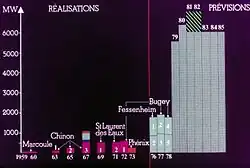 Après le succès des réacteurs expérimentaux de Marcoule, EDF est chargée de mettre en place le programme électronucléaire français avec des réacteurs du même type, Uranium naturel graphite gaz (UNGG). Pour atteindre au plus vite la compétitivité, l'entreprise publique lance des réacteurs de puissance croissante en tirant les leçons de la construction des précédents sans attendre qu'ils soient en service[86]. Ainsi, dans le but de faire baisser les coûts, les prototypes se succèdent : trois sur le site de Chinon (EDF1, EDF2 et EDF3) puis deux à Saint-Laurent-des-Eaux (EDF4 et EDF5)[87]. Le dernier prototype, à Bugey, doit amorcer une série de six centrales identiques et ouvrir la voie vers les 1 000 MWe de puissance grâce à de nouveaux types de combustibles.