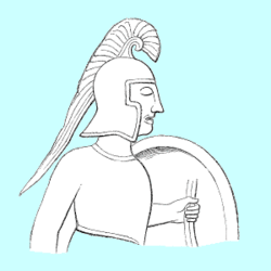 - Les hoplites : ils étaient diversement armés, les tuniques ou armures les recouvraient complètement et lourdement. Ils portaient un casque, une cuirasse métallique et des jambières. Armés d'une lance et d'une courte épée ils se protégeaient à l'aide d'un bouclier (appelé clipeus à Rome) de forme circulaire d'un diamètre d'environ 1 mètre. Les meilleurs occupaient les premiers rangs et cherchaient la confrontation directe avec l’ennemi.