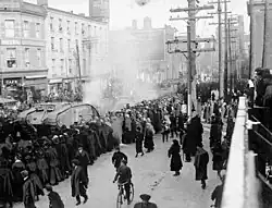 C'était pendant cette période de remise en cause de la présence de l'armée britannique et de son éventuel retrait que la dernière tentative d'invasion du Canada se présenta. Elle n'était pas l'objet d'une quelconque force américaine officielle, mais provenait d'une organisation appelée les Fenians. C'était un groupe d'Américains d'origine irlandaise, pour la plupart vétérans de la guerre de Sécession, qui pensaient que le fait de s'emparer du Canada pourraient leur permettre d'obtenir des concessions du gouvernement britannique à propos de l'Irlande[10]. Les Fenians avaient estimé également, ce qui s'est révélé être une erreur, que les Canadiens d'origine irlandaise, assez nombreux, soutiendraient leur action et monteraient en puissance, tant au point de vue militaire que politique.