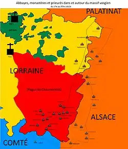 Dans le duché de Haute-Lorraine divisé en « pays » ou pagi, le pagus du Chaumontois était très vaste et moins peuplé que les autres car il recouvrait toute la partie montagneuse du massif au sud. Le Chaumontois, vaste contrée forestière vallonnée, s'arrête aux crêtes vosgiennes aux sources de la Meurthe et de la Moselle. Les époques mérovingienne et carolingienne favorisent la création de monastères et abbayes[5] en leur octroyant des privilèges pour la conservation desquels ils lutteront sans relâche quand les dynasties changeront. Cela correspond également à la christianisation du pays ou à une refonte de la vie en communauté selon des règles plus strictes. Dans les hautes vallées alsaciennes ou sur le piémont des Vosges, quelques abbayes anciennes possédaient déjà de vastes terrains au sein du massif. Du côté lorrain, la pénétration de la montagne est encore relative. C'est pourquoi les ermites et les religieux désireux de vivre en retrait de tout trouvent dans les hautes vallées lorraines des endroits idéaux pour installer un couvent à l'emplacement d'un ancien castrum élevé ou en fond de vallée. Si l'abbaye de Munster se trouve côté alsacien presque au pied du Hohneck, les premières abbayes lorraines de même rang sont encore éloignées des chaumes. Elles jalonnent les premiers contreforts gréseux dans un premier temps.