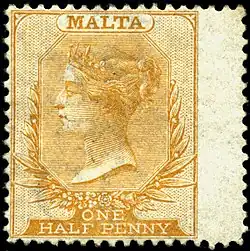 Le premier timbre de Malte est émis en 1860 pour affranchir le courrier intérieur de l'archipel, jusqu'alors transporté gratuitement et déposé aux postes de police où les habitants se déplaçaient[4]. À l'effigie de la reine Victoria, le demi-penny jaune permet le transport d'un pli de moins d'une demi-once, deux timbres pour une once[4].