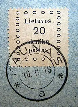 La première émission de timbres spécifiques à la Lituanie eut lieu à la première période d’indépendance en 1918. Cette série, au motif assez rudimentaire a pour nom « Baltukai ». On y relève deux villes d’émission, Vilnius en 1918 et Kaunas en 1919. Trois séries avec des motifs peu différents ont été produites à Kaunas.