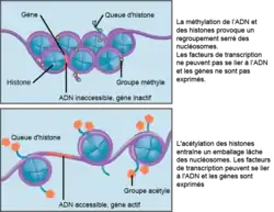 Ce degré de condensation est regulé par des modifications des extrémités N-terminales des histones, comme des phosphorylations, acétylations, méthylations, ubiquitinations, sumoylations, etc. l'ensemble de ces modifications étant catalysées par des enzymes spécifiques. Les modifications covalentes des histones agiraient soit directement en modifiant la compaction de l'enroulement d'ADN autour des nucléosomes, soit indirectement en constituant des « marques » permettant le recrutement de protéines capables de modifier la structure de la chromatine. Le modèle des modifications covalentes des histones agissant comme un code (le « code des histones ») a été proposé par Strahl et Allis en 2000 dans la revue Nature[10]. Cependant, ce code est, semble-t-il, loin d'être universel et plutôt relativement spécifique selon les gènes et les cellules considérés.