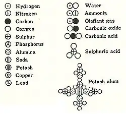 D'une manière similaire, John Dalton, en 1803, prend le poids atomique de l'hydrogène, l'élément le plus léger, comme unité, et détermine, par exemple, que le rapport pour l'anhydride d'azote était de 2 pour 3 ce qui donne la formule N2O3. Dalton imagine, à tort, que les atomes "s'accrochent" ensemble pour former des molécules. Plus tard, en 1808, Dalton publie son célèbre diagramme des "atomes" combinés :