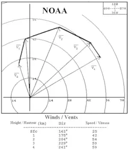 L'hodographe est utilisé en météorologie pour pointer les données de vents d'un radiosondage. Il prend la forme d'un diagramme polaire où la direction est indiquée par l'angle au centre de la figure et la grandeur par la distance avec ce centre[1]. Dans la figure à droite, on a dans la partie du bas la grandeur et la direction des vents à différentes altitudes au-dessus du sol. Ceux-ci sont pointés comme les vecteurs à . L'hodographe est donc la ligne qui joint les têtes de ces vecteurs[2],[3].