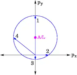 Ainsi dans l'image ci-contre, les quatre points (1 à 4) représentent quatre moments de l'année orbitale d'une planète à l'orbite elliptique et le cercle est sa trajectoire selon les lois de Kepler de la conservation du moment cinétique. Ces quatre points sont :