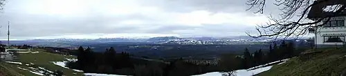 La vue sur les Alpes par beau temps porte à l'ouest jusqu'au Grünten et à l'est jusqu'au massif du Wetterstein.