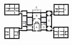 Ces plans se caractérisent notamment par un large bloc central de deux niveaux. À l'étage du piano nobile « étage noble », on trouve une série d'appartements d'état situées autour de deux cours intérieurs. celles-ci ont une fonction architecturale plus que récréative ; elles sont prévues pour apporter de la luminosité. Le bloc central est ensuite flanqué de quatre ailes rectangulaires[7]. Celles-ci sont liées au corps central par de petites ailes d'une baie sur deux niveaux[2].