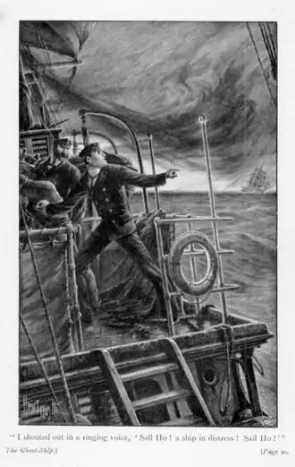 « À environ trois milles de distance, au centre de cette lueur, qui s'étendait à environ quinze degrés au-dessus de l'horizon, était un grand vaisseau qui semblait lutter contre un ouragan violent, quoiqu'il fît un calme plat. Il plongeait et s'élevait sur une eau parfaitement tranquille : tantôt disparaissant sous les flots, tantôt se remontrant à la surface. Sa grand'voile et ses huniers étaient serrés, et il ne portait que sa misaine dont les ris étaient pris, une voile d'étais et une voile de senau sur son arrière. Ce bâtiment semblait poussé par la force du vent vers le Ter Schilling. À chaque instant on le distinguait mieux. Enfin on le vit virer de bord ; et pendant cette manœuvre il était à si peu de distance qu'on aurait pu compter les hommes sur le pont. Mais à ce moment une obscurité soudaine l'enveloppa, et on ne le revit plus[12]. »