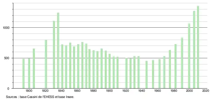 L'évolution du nombre d'habitants est connue à travers les recensements de la population effectués dans la commune depuis 1793. À partir du , les populations légales des communes sont publiées annuellement dans le cadre d'un recensement qui repose désormais sur une collecte d'information annuelle, concernant successivement tous les territoires communaux au cours d'une période de cinq ans. Pour les communes de moins de 10 000 habitants, une enquête de recensement portant sur toute la population est réalisée tous les cinq ans, les populations légales des années intermédiaires étant quant à elles estimées par interpolation ou extrapolation[5]. Pour la commune, le premier recensement exhaustif entrant dans le cadre du nouveau dispositif a été réalisé en 2005[6],[Note 1].