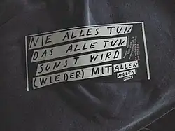 - ↑ Traduction littérale : Ne jamais faire tout / ce que tous font / sinon il sera / (à nouveau) à tous / tout / fait. Ce poème sous-entend une critique du conformisme de masse, susceptible d'engendrer de nouvelles tragédies historiques.