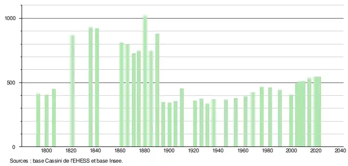 L'évolution du nombre d'habitants est connue à travers les recensements de la population effectués dans la commune depuis 1793. Pour les communes de moins de 10 000 habitants, une enquête de recensement portant sur toute la population est réalisée tous les cinq ans, les populations de référence des années intermédiaires étant quant à elles estimées par interpolation ou extrapolation[26]. Pour la commune, le premier recensement exhaustif entrant dans le cadre du nouveau dispositif a été réalisé en 2004[27].