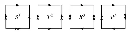Les bords du carré peuvent ensuite être recollés de différentes manières. Le carré peut être tordu pour permettre aux bords de se rencontrer dans la direction opposée, comme indiqué par les flèches sur le diagramme. Jusqu'à symétrie, il existe quatre manières différentes de coller les côtés, chacune créant une surface différente.