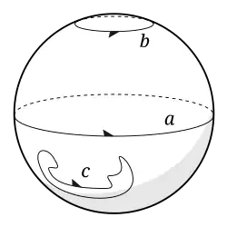 Sur la sphère ordinaire , le cycle b du diagramme peut être réduit au pôle, et même le grand cercle équatorial a peut être réduit de la même manière. Le théorème de Jordan montre que tout cycle arbitraire comme c peut être réduit de la même manière à un point. Tous les cycles de la sphère peuvent donc être transformés en permanence et appartiennent à la même classe d'homologie. On dit qu'ils sont homologues à zéro. Découper une variété le long d'un cycle homologue à zéro la sépare en deux composantes ou plus. Par exemple, découper la sphère le long de a produit deux hémisphères.