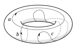 Ce n'est généralement pas le cas des cycles sur d'autres surfaces. Le tore a des cycles qui ne peuvent pas être continuellement déformés les uns dans les autres, par exemple, dans le diagramme, aucun des cycles a, b ou c ne peut être déformé l'un dans l'autre. En particulier, les cycles a et b ne peuvent pas être réduits à un point alors que le cycle c le peut, le rendant ainsi homologue à zéro.