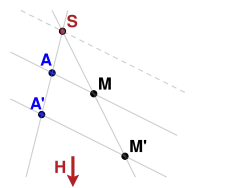 - Soit M un point de P(E) distinct de S et hors de H et de la droite (SA). Toutes les droites passant par S sont globalement invariantes car elles intersectent H et passent donc par deux points fixes. Soit N le point d'intersection de la droite (AM) et de H. Ce point étant fixe l'image de la droite (AM) est la droite (A'N). L'image M' de M est donc à l'intersection de la droite (A'N) et de la droite (SM), toutes deux coplanaires, ce qui détermine M'.