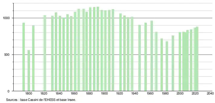 L'évolution du nombre d'habitants est connue à travers les recensements de la population effectués dans la commune depuis 1793. Pour les communes de moins de 10 000 habitants, une enquête de recensement portant sur toute la population est réalisée tous les cinq ans, les populations de référence des années intermédiaires étant quant à elles estimées par interpolation ou extrapolation[27]. Pour la commune, le premier recensement exhaustif entrant dans le cadre du nouveau dispositif a été réalisé en 2004[28].