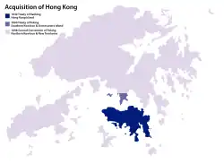 Initialement constituée de l'île de Hong Kong, la colonie s'agrandit avec la péninsule de Kowloon en 1860 puis les Nouveaux Territoires en 1898.