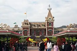 L'entrée du parc et de Main Street, USA est située sous la gare principale du Hong Kong Disneyland Railroad, voyage en train à vapeur.