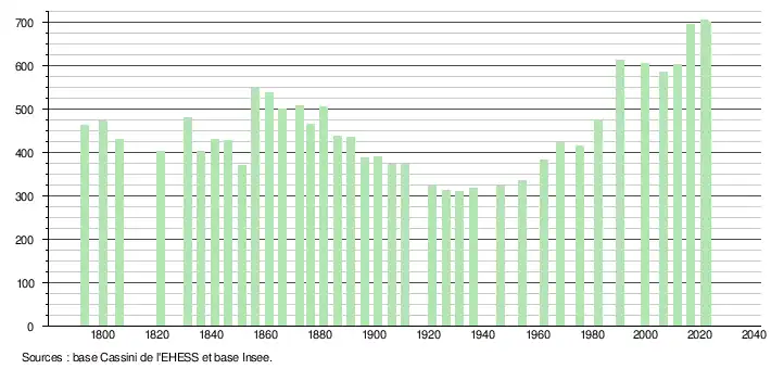 L'évolution du nombre d'habitants est connue à travers les recensements de la population effectués dans la commune depuis 1793. Pour les communes de moins de 10 000 habitants, une enquête de recensement portant sur toute la population est réalisée tous les cinq ans, les populations de référence des années intermédiaires étant quant à elles estimées par interpolation ou extrapolation[26]. Pour la commune, le premier recensement exhaustif entrant dans le cadre du nouveau dispositif a été réalisé en 2006[27].