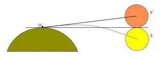 S (en jaune) est la position réelle du Soleil. S' (en rouge) est la position apparente vue par un observateur dont la ligne d'horizon est la droite bleue.