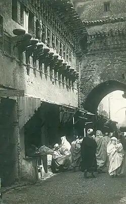 - « A main gauche de Taala, en face de la Medrasa, se trouve le grand m'taher, endroit pour les ablutions. Sur la façade de ce m'taher on remarque à cinq ou six mètres de hauteur plusieurs disques d'environ cinquante centimètres de diamètre et ressemblant à de grands plats creux. On raconte qu'il y a de longues années des aiguilles se trouvaient dans ces assiettes qui auraient été des cadrans d'horloge. Les pendules étaient mises en mouvement par un magicien au moyen d'un raçd[n 2], c'est-à-dire qu'il réglait sans doute les pendules par des observations astronomiques. Un magicien juif dont le pouvoir était supérieur à l'autre (c'est toujours la légende qui parle) détruisit l'influence du raçd » A. Pèretié, « Les Médrasas de Fès », Archives marocaines, vol. XVIII, 1911, p. 282[1].