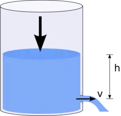 Soit un vase de forme verticale constante, un cylindre par exemple, contenant un fluide tel que eau ou mercure. Un petit orifice vers la base du récipient, dans sa paroi mince, permet l'écoulement du liquide. Cet écoulement n'est pas constant ; il dépend de la hauteur du fluide au-dessus de l'orifice.