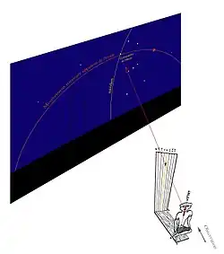 Ce type de repère a inspiré à l'égyptologue Hans Schack-Schackenburg une reconstitution plausible de l'instrument d'observation ayant permis l'élaboration de telles tables (voir figure ci-contre). Orienté suivant l'axe nord-sud, l'observateur, aidé de sa clepsydre, pouvait pointer une étoile alignée avec une ligne verticale de la grille et un repère de la figure humaine. L'exemple figure l'observation imaginaire de l'étoile Bételgeuse de la constellation d'Orion, située sur le méridien, et par conséquent visée au milieu du visage de l'homme assis. Sa position sur la table stellaire est donc sur la cinquième ligne. Si, l'heure suivante, aucune étoile n'est visible sur le méridien, alors, l'étoile la plus brillante la plus proche du méridien et située sur l'un des repères verticaux adjacents est choisie comme référence. Il en va ainsi pour chaque heure de la nuit.
