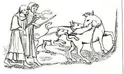 - 1 2 Version originale : a pony with an ape fastened on its back, and to see the animal kicking among the dogs, with the screams of the ape, beholding the curs hanging from the ears and neck of the pony, is very laughable.. Traduit de l'espagnol par (en) E. K. Chambers, The Elizabethan Stage., vol. 2, Oxford, Clarendon Press, , p. 454