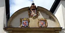 L'entrée principale du Musée national d'histoire naturelle, au no 25 de la rue Münster comprend un portail monumental entre deux colonnes corinthiennes. Sur le pignon du portail, il y a trois armoiries. Celles du haut correspondent au blason du roi d'Espagne Charles II, qui règne sur le duché de Luxembourg en 1674 lors de la reconstruction de l'hospice. Sur la gauche, les armoiries du duché avec le lion rouge emblématique et sur la droite, les armoiries de Philippe de Croy, gouverneur du Luxembourg[2].