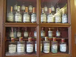 Cette apothicairerie comprend deux petites pièces avec ses étagères de flacons et de fioles. La première salle (le laboratoire) présente un mortier en bronze doté d'un arc accroché au pilon permettant d'alléger son poids et ainsi de faciliter le travail des apothicaires lors de la préparation des remèdes. Dans la deuxième salle (la pharmacie), les étagères présentent une collection de 130 pots de faïence datés de 1782 dans lesquels étaient conservés plantes médicinales, onguents, huiles, pilules et sirops de la pharmacopée des simples médecines.