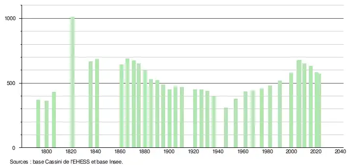 L'évolution du nombre d'habitants est connue à travers les recensements de la population effectués dans la commune depuis 1793. Pour les communes de moins de 10 000 habitants, une enquête de recensement portant sur toute la population est réalisée tous les cinq ans, les populations de référence des années intermédiaires étant quant à elles estimées par interpolation ou extrapolation[17]. Pour la commune, le premier recensement exhaustif entrant dans le cadre du nouveau dispositif a été réalisé en 2005[18].