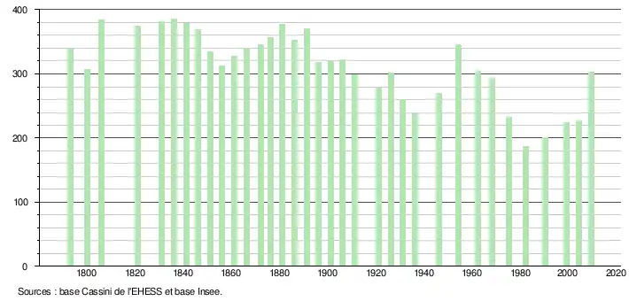 - ↑ Dans le tableau des recensements et le graphique, par convention dans Wikipédia, le principe a été retenu, pour les populations légales postérieures à 1999 de n’afficher dans le tableau des recensements et le graphique que les populations correspondant à l'année 2006, première population légale publiée calculée conformément aux concepts définis dans le décret no 2003-485 du 5 juin 2003, et les années correspondant à une enquête exhaustive de recensement pour les communes de moins de 10 000 habitants, ainsi que la dernière population légale publiée par l’Insee.
