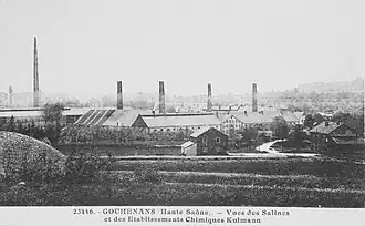 Cette usine assure chaque année la production de 40 000 quintaux d'acide chlorhydrique, d'acide sulfurique et de sulfate de soude dans les années 1890. Elle appartient alors à la Compagnie Anonyme des Salines, Houillères et Fabrique de produits chimiques de Gouhenans. En 1895, trois trous de sonde de cent mètres de profondeur permettent la production de 61 550 quintaux de sel. L'année suivante, un embranchement ferroviaire est créé à l'ouverture de la ligne de Montbozon à Lure qui longe le complexe. En 1905, une verrerie construite au nord du site en 1903 compte entre trente et quarante ouvriers[i 1]. Elle fabrique notamment des bouteilles de bière destinées aux producteurs alsaciens[2] et connaît plusieurs interruptions et ferme définitivement après la Première Guerre mondiale[i 1]. La grande cheminée évacue les gaz issus de la fabrication de sulfate de soude et d'acide sulfurique. Elle évacue également la fumée des chaudières à vapeur qui alimente des génératrices électrique. Lorsque le village de Gouhenans est alimenté en électricité par la centrale thermique de Ronchamp, les génératrices de l'usine chimique sont connectées au réseau et l'alimente de façon complémentaire[5]. En 1916, la partie de la grande cheminée située à 50 mètres de haut, qui s'est incliné, est redressée par des ouvriers spécialisés[6]. En 1927, le site est partagé entre deux sociétés : la Société Minière et Industrielle de Gouhenans, et la Société de produits chimiques Kuhlmann qui embauche 70 personnes en 1931. Malgré l'ajout de neuf poêles en 1926, la production de sel décroît progressivement et passe de 8 249 tonnes en 1912 à 7 200 tonnes en 1943[i 1]. Ce déclin est dû à une augmentation de coût de transport de la houille accompagné d'un manque de rentabilité et d'investissement qui cause une perte de compétitivité face aux marais salants[7].
