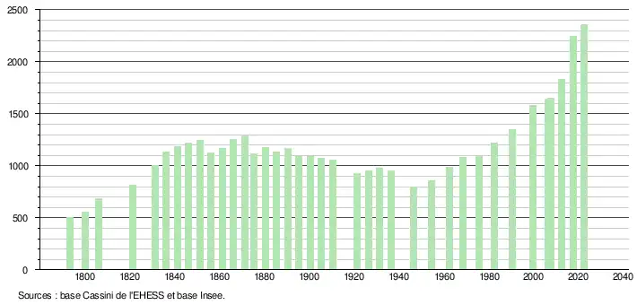 L'évolution du nombre d'habitants est connue à travers les recensements de la population effectués dans la commune depuis 1793. Pour les communes de moins de 10 000 habitants, une enquête de recensement portant sur toute la population est réalisée tous les cinq ans, les populations de référence des années intermédiaires étant quant à elles estimées par interpolation ou extrapolation[18]. Pour la commune, le premier recensement exhaustif entrant dans le cadre du nouveau dispositif a été réalisé en 2007[19].