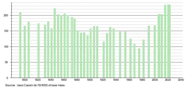 L'évolution du nombre d'habitants est connue à travers les recensements de la population effectués dans la commune depuis 1793. Pour les communes de moins de 10 000 habitants, une enquête de recensement portant sur toute la population est réalisée tous les cinq ans, les populations de référence des années intermédiaires étant quant à elles estimées par interpolation ou extrapolation[17]. Pour la commune, le premier recensement exhaustif entrant dans le cadre du nouveau dispositif a été réalisé en 2005[18].