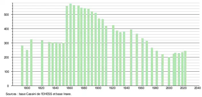 L'évolution du nombre d'habitants est connue à travers les recensements de la population effectués dans la commune depuis 1793. Pour les communes de moins de 10 000 habitants, une enquête de recensement portant sur toute la population est réalisée tous les cinq ans, les populations de référence des années intermédiaires étant quant à elles estimées par interpolation ou extrapolation[33]. Pour la commune, le premier recensement exhaustif entrant dans le cadre du nouveau dispositif a été réalisé en 2008[34].