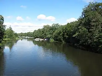 Le bras Huumanhaara du fleuve Kymijoki et quais de bateaux à Hovila.