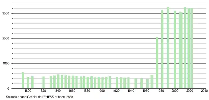 L'évolution du nombre d'habitants est connue à travers les recensements de la population effectués dans la commune depuis 1793. Pour les communes de moins de 10 000 habitants, une enquête de recensement portant sur toute la population est réalisée tous les cinq ans, les populations de référence des années intermédiaires étant quant à elles estimées par interpolation ou extrapolation[27]. Pour la commune, le premier recensement exhaustif entrant dans le cadre du nouveau dispositif a été réalisé en 2008[28].