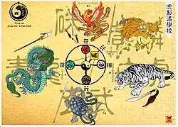 - puis le cycle dit Tao, selon le travail rattaché aux animaux taoïstes, cardinaux ou mythiques (Tigre blanc de l'Ouest, Tortue noire du Nord, Dragon azur de l'Est, Phoenix vermillon du Sud, Licorne) permettant l'accès au travail énergétique et subtile.