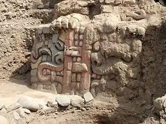 Le principal être mythologique représenté dans ces frises en hauts-reliefs d'adobe multicolores est l'objet de diverses interprétations :