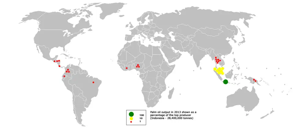 En douze ans (2006-2018), la production d'huile de palme a presque doublé, de 36,03 Mt à 69,6 Mt, dont 87 % en Indonésie et en Malaisie, le reste en Thaïlande, Nigeria, Colombie et plus récemment au Gabon. Les principaux importateurs sont l'Inde (9,5 Mt), l'Union européenne (6,5 Mt), la Chine (5,1 Mt), le Pakistan (3,1 Mt) et les États-Unis (1,6 Mt). L'huile de palme est un marché ultra-rentable à l'hectare : une plantation de palmier à huile produit huit fois plus d'huile qu'un champ de soja et six fois plus qu'un champ de colza, selon l'Alliance française pour l'huile de palme durable[37].