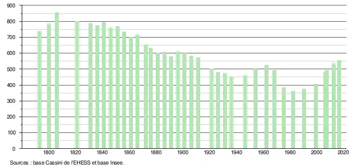 L'évolution du nombre d'habitants est connue à travers les recensements de la population effectués dans la commune depuis 1793. Pour les communes de moins de 10 000 habitants, une enquête de recensement portant sur toute la population est réalisée tous les cinq ans, les populations de référence des années intermédiaires étant quant à elles estimées par interpolation ou extrapolation[10]. Pour la commune, le premier recensement exhaustif entrant dans le cadre du nouveau dispositif a été réalisé en 2007[11].