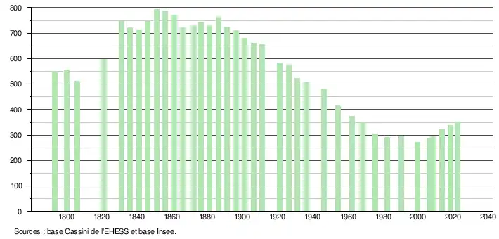 L'évolution du nombre d'habitants est connue à travers les recensements de la population effectués dans la commune depuis 1793. Pour les communes de moins de 10 000 habitants, une enquête de recensement portant sur toute la population est réalisée tous les cinq ans, les populations de référence des années intermédiaires étant quant à elles estimées par interpolation ou extrapolation[15]. Pour la commune, le premier recensement exhaustif entrant dans le cadre du nouveau dispositif a été réalisé en 2008[16].