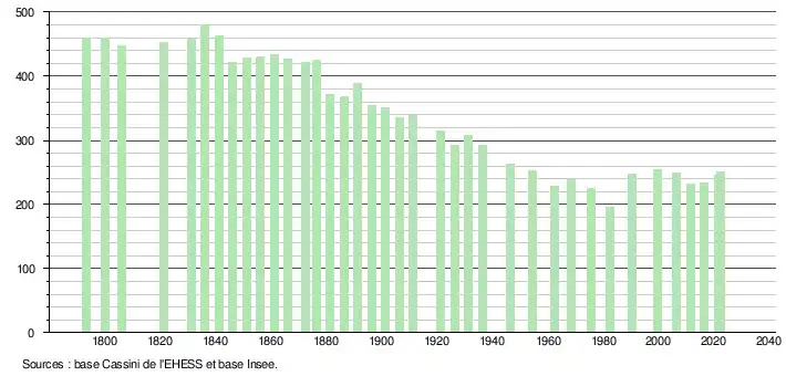 L'évolution du nombre d'habitants est connue à travers les recensements de la population effectués dans la commune depuis 1793. Pour les communes de moins de 10 000 habitants, une enquête de recensement portant sur toute la population est réalisée tous les cinq ans, les populations de référence des années intermédiaires étant quant à elles estimées par interpolation ou extrapolation[35]. Pour la commune, le premier recensement exhaustif entrant dans le cadre du nouveau dispositif a été réalisé en 2006[36].